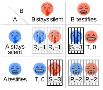 The “dilemma” is blind trust in another individual’s choice. When A and B have committed the crime—and know each other did—then the “safest” choice is to implicate the other. In the payoff matrix above, three of the four outcomes result in at least one prisoner remaining—the district attorney gets a conviction and is one step closer to re-election.