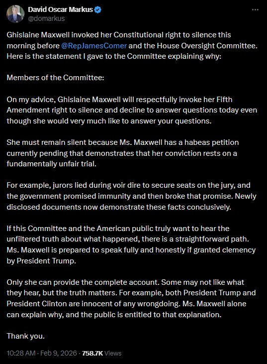 Maxwell’s attorney issued this statement on February 9, 2026: