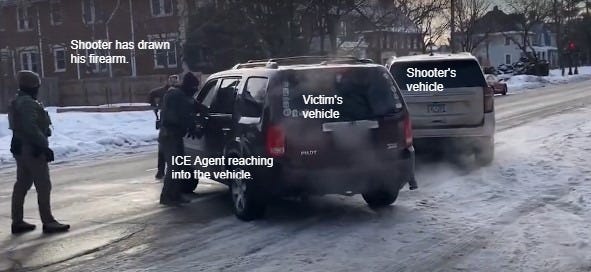 But in the videos that have circulated, it is clear that the ICE officer not only was never touched by the car, but that when he first discharged his gun, he was to the side of the vehicle. Also, he never went to the hospital. Instead he got into his vehicle and drove away. Real cops, even when they kill an unarmed person, don’t flee the scene.