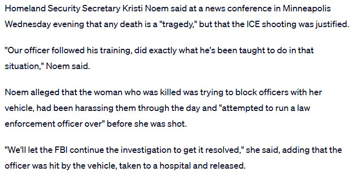 Homeland Security Secretary Kristi Noem said at a news conference in Minneapolis Wednesday evening that any death is a “tragedy,” but that the ICE shooting was justified.