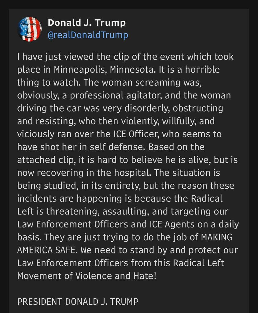 I have just viewed the clip of what took place in Minneapolis, Minnesota. It is a horrible thing to watch. The woman screaming was, obviously, a professional agitator, and the woman driving the car was very disorderly, obstructing and resisting, who then violently, willfully, and viciously ran over the ICE officer, who seems to have shot her in self defense. Based on the attached clip, it is hard to believe he is still alive, but is now recovering in the hospital. The situation is being studied, in its entirety, but the reason these incidents are happening is because the Radical Left is threatening, assaulting, and targeting our Law Enforcement Officers and ICE Agents on a daily basis. THey are just trying to do the job of MAKING AMERICA SAFE. We need to stand by and protect our Law Enforcement Officers from this Radical Left Movement of Violence and Hate!