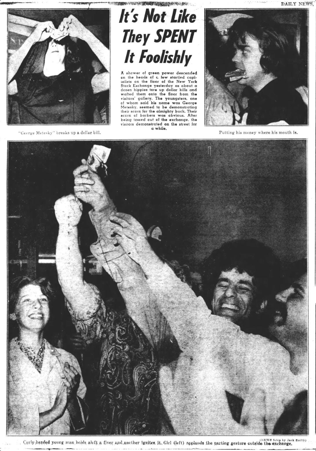 The Yippies believed they could showcase the existential silliness of war or capitalism, by levitating the Pentagon (the government claims it never happened) or tossing $1 bills onto the floor of the New York Stock Exchange to watch traders stop trading for the sake of a few singles.