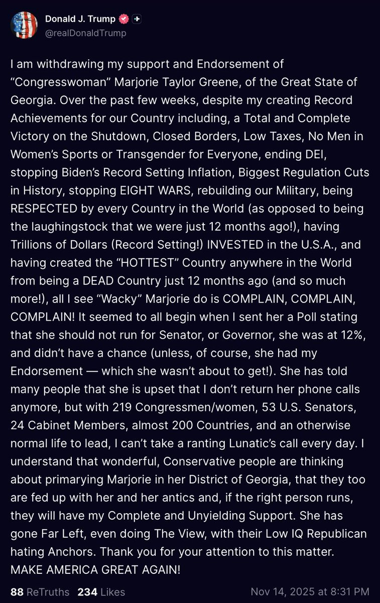 Reports are Marjorie Taylor Greene sent a text to Trump on November 14, asking him to release the Epstein files. This was his public reply: