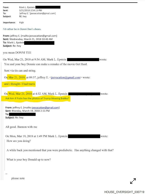 There was also a release of a handful of emails from the Epstein files, where we discover that Trump lied about having nothing to do with Epstein after their “falling out” over the “stolen” teen “masseuses.” They were hanging (and banging?) into Trump’s first term. Then there’s the 2018 note from Epstein’s brother (not Epstein’s mother, of Welcome Back Kotter fame) alluding to photos Putin might have of “Trump blowing Bubba.”