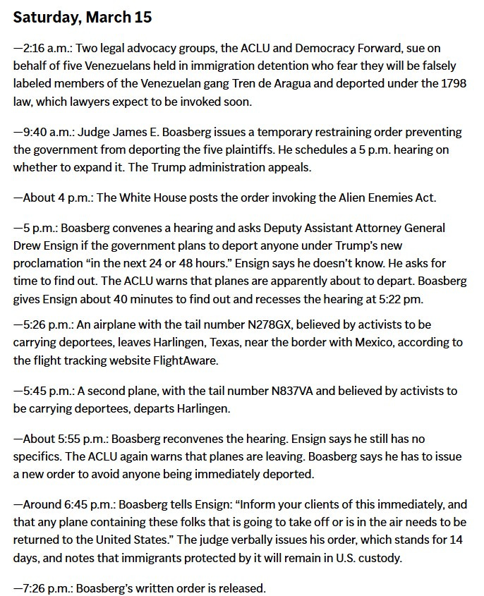 The particulars of the case are still being worked out—Trump has called for Boasberg’s impeachment—and the Judiciary’s lack of an enforcement mechanism leaves little hope for a legal resolution. Indisputably, the President broke the law when violating the court order, but the President cannot ever be held responsible for breaking the law when conducting what the Supreme Court might find an Official Duty. Since border protection of any imaginable sort would fall under an Official Duty, there is no means to hold the President accountable for gross and repeated contempt of court.