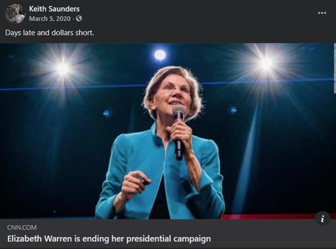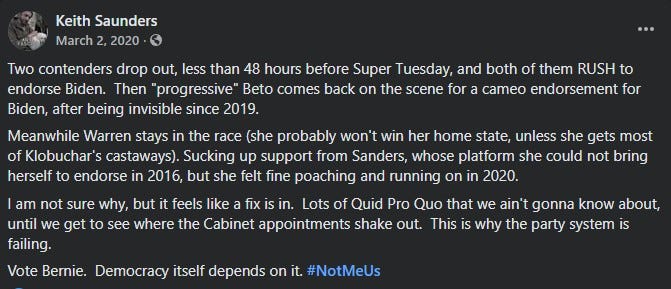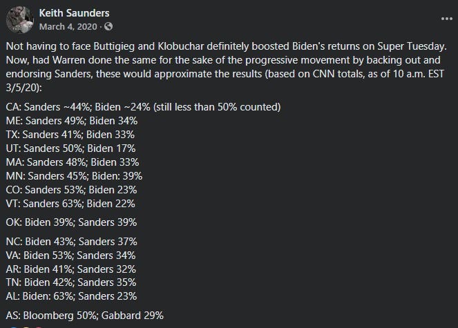 For Joe Biden (who had still never won a presidential primary at the time) Pete & Amy tanking their campaigns alone would not have been enough. Of equal importance was Elizabeth Warren not leaving the race, and siphoning progressive-leaning voters from casting ballots for Bernie Sanders.