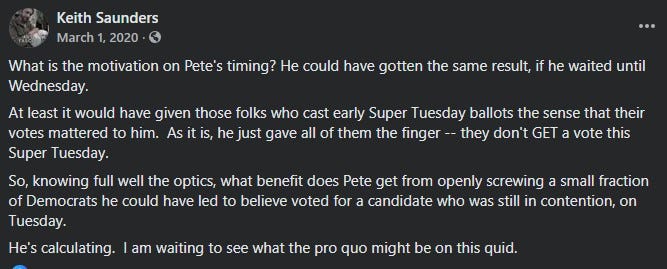 So, knowing full well the optics, what benefit does Pete get from openly screwing a small fraction of Democrats he could have led to believe voted for a candidate who was still in contention, on Tuesday.