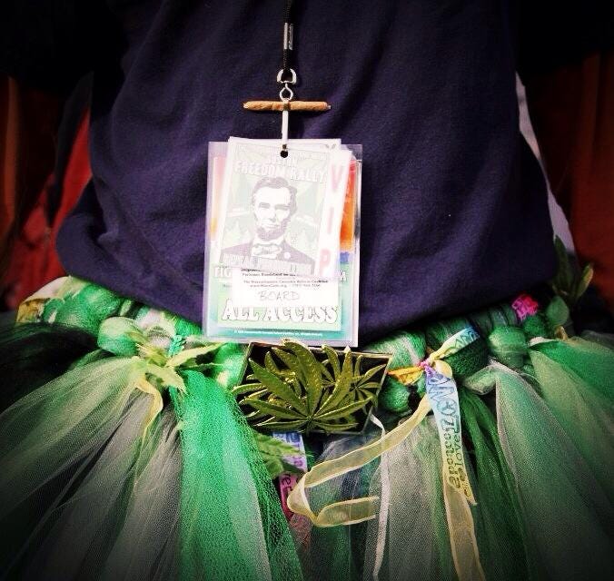 Your voice becomes much bigger than you are, I recall Mick Jagger explaining. That’s why he chose to wear brightly-colored American football pants during their Tattoo You tour, and I also wanted to find a way of making my appearance stand out while on stage in front of acres of people. The Reform Tutu was created by Susie Kandt, and for a stretch of several years it was part of my reform festival uniform at the Boston Freedom Rally and Seattle Hempfest.