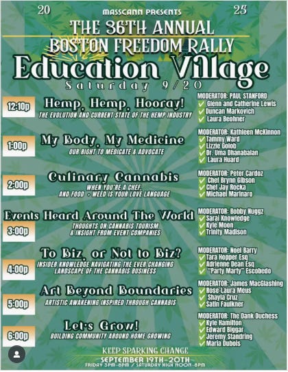 The Massachusetts Cannabis Reform Coalition continues its mission through the Educational Village at the Freedom Rally. As part of its public service MassCann assembles leading experts from across the spectrum of cannabis specializations and makes them accessible without conference or seminar fees. This year’s Educational Village lineup is here