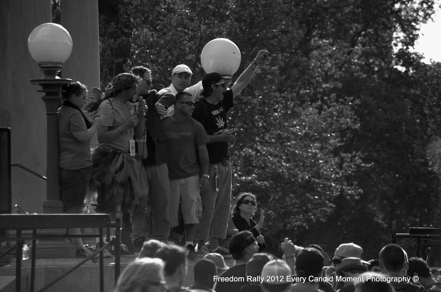 Whenever the Freedom Rally has two stages, and occasionally, when there is only one, we utilize the Parkman Bandstand. The bandstand is wired for electricity, so it makes for a simpler production, save for having to hire a city-licensed electrician to turn the power on. The electrical panel is under the foundation, and accessible through a padlocked, iron door, which the electrician will leave unlocked for the day if you pass them some weed. That gives those in the know a safer place to smoke or engage in other activities, out of public view.