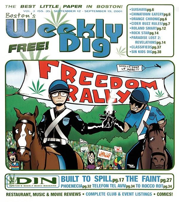 9/15/01-- The Boston Freedom Rally is held as scheduled, four days after the 9/11 attack. Boston Mayor Tom Menino calls MassCann president Bill Downing and asks that the event be canceled, meanwhile Menino is working with the directors of a dozen local museums, to arrange for free public admission that weekend. Downing refuses, MassCann's board has three members resign in protest of his decision. A ban on air travel means Featured Guest Woody Harrelson would remain in Ireland, and did not make it to Boston.
