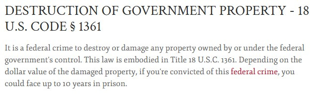 It is a federal crime to destroy or damage any property owned by or under the federal government’s control. This law is embodied in Title 18 U.S.C. 1361. Depending on the dollar value of the damaged property, if you’re convicted of this federal crime, you could face up to 10 years in prison.