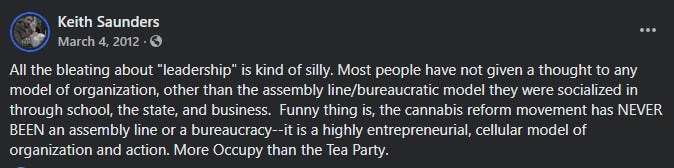All the bleating about "leadership" is kind of silly. Most people have not given a thought to any model of organization, other than the assembly line/bureaucratic model they were socialized in through school, the state, and business. Funny thing is, the cannabis reform movement has NEVER BEEN an assembly line or a bureaucracy--it is a highly entrepreneurial, cellular model of organization and action. More Occupy than the Tea Party.