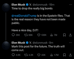 It was not a week ago that FBI Director Kash Patel appeared on The Joe Rogan Experience podcast at exactly the time Elon Musk was suffering a major dopamine crash (His Ketamine use disorder was brought to public attention, so like any good junkie he went cold turkey to prove a point—he will relapse later) and flaming Donald Trump with since-deleted tweets. Here’s what it looked and sounded like. Transcript from 1:28:09 to 1:30:29.