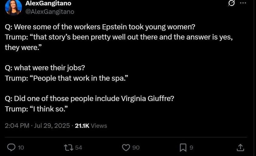 While I have Substack posts in development, I prefer to write whole pieces as soon as I rise in the morning. I wrote 90% of this essay, however, around 6 p.m. on July 29, right about the time Trump’s Air Force One explanation for his falling out with Jeffrey Epstein became public. While Trump is still seeking cover, he ended up confessing that he had hired teen girls as masseuses.