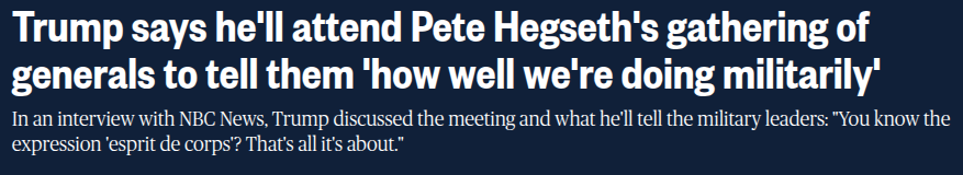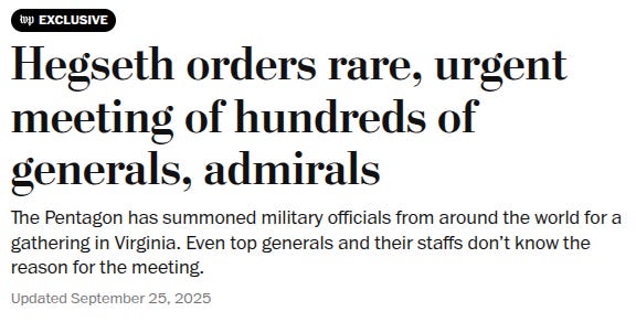 On September 25 the Washington Post reported that Hegseth was calling the generals back to Quantico, VA.