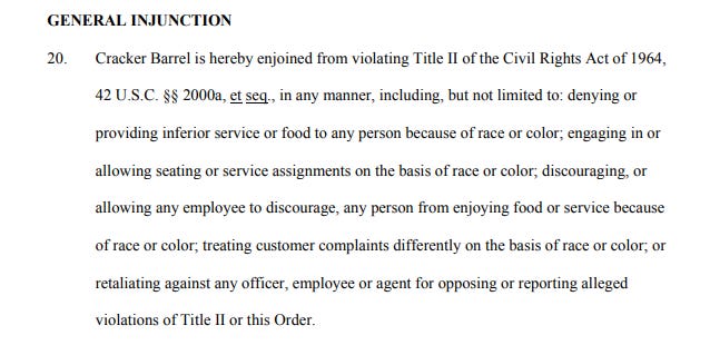 20. Cracker Barrel is hereby enjoined from violating Title II of the Civil Rights Act of 1964, 42 U.S.C. 2000a, et seq, in any manner, including, but not limited to: denying or providing inferior service or food to any person because of race or color; engaging in or allowing seating or service assignments on the basis of race or color; discouraging, or allowing any employee to discourage, any person from enjoying food or service because of race or color; treating customer complaints differently on the basis of race or color; or retaliating against any officer, employee or agent for opposing or reporting alleged violation of Title II or this Order.