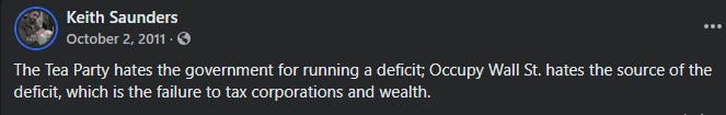 The Tea Party hates the government for running a deficit; Occupy Wall St. hates the source of the deficit, which is the failure to tax corporations and wealth.