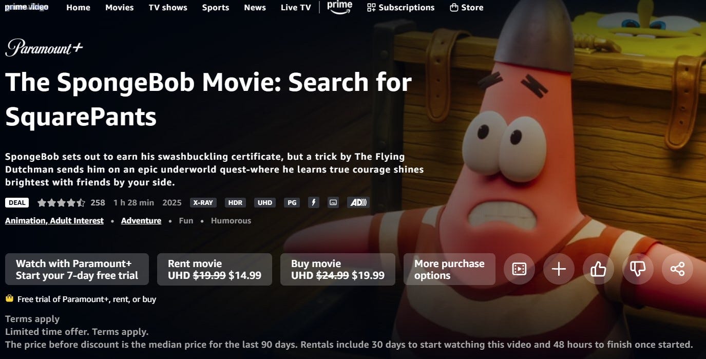 If you want to watch the newest SpongeBob movie, that will be $14.99 (to rent), in addition to your basic (with ads) monthly subscription fee of $8.99 to Paramount+. This is only possible if you also pay $10.99 a month for Amazon Prime.