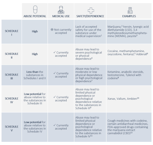 The CSA consolidated what had once been a patchwork of substance-specific drug regulations and prohibitions, under one rubric, with measures of Medicinal Value and Abuse Potential used to place all drugs under five schedules. The least-restrictive, Schedule V, consisting of OTC medications, and Schedule IV - II ascending in degrees of control with Schedule I reserved for drugs found to have no generally recognized medicinal value and a high potential for abuse