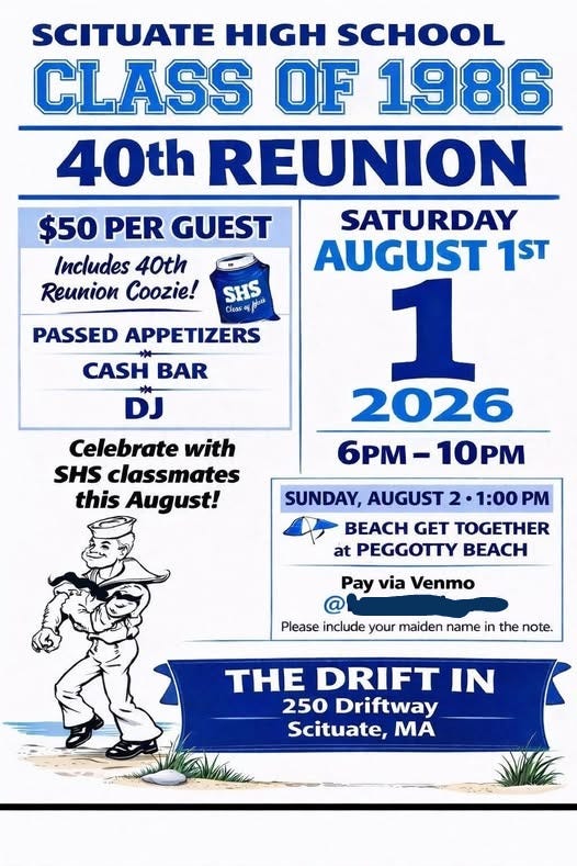 The members of the Scituate High School Class of 1986 were born in the late 1960’s, a large portion of them (myself included) whose parent(s) had also been educated in the SPS system. My mother’s was the first class to graduate from the “new” high school building (1962); she and I shared a few teachers there, 24 years apart.
