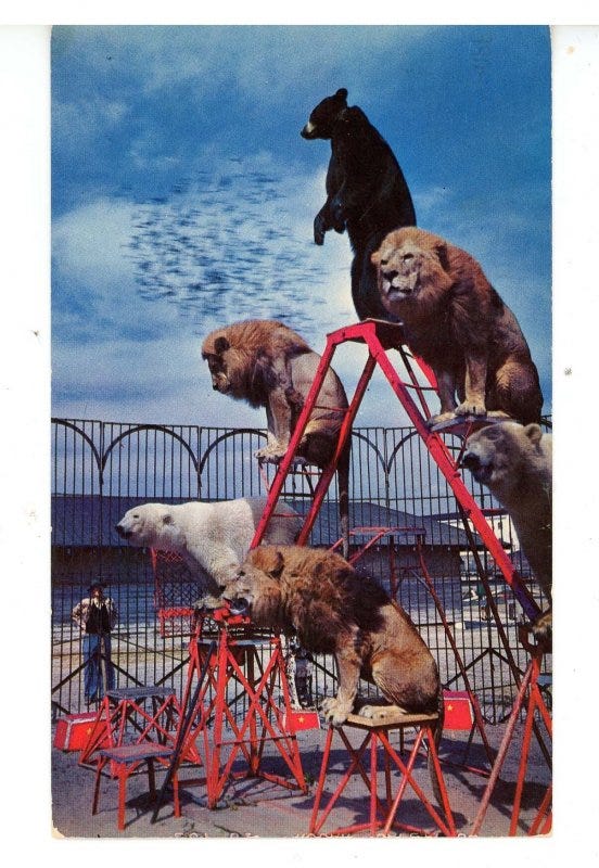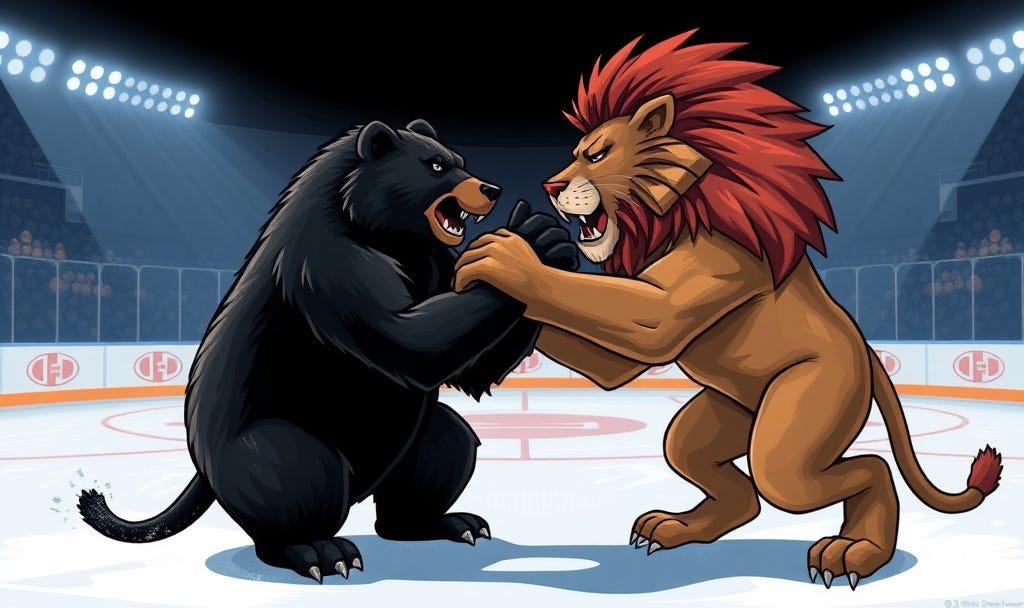 I countered—Au contraire! Ringling Brothers Barnum & Bailey Circus toured with both lions and bears at the same time. I once attended a show in the Boston Garden on a floor installed atop the ice rink where the Boston Bruins play, so the likelihood of the two animals being together on a hockey rink is not as small as one might assume.