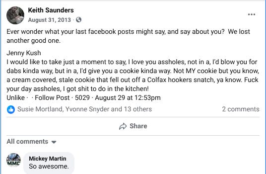 I would like to take just a moment to say, I love you assholes, not in a, I’d blow you for dabs kinda way, but in a, I’d give you a cookie kinda way. Not MY cookie but you know, a cream covered, stale cookie that fell out of a Colfax hookers snatch, ya know. Fuck your day assholes, I got shit to do in the kitchen.
