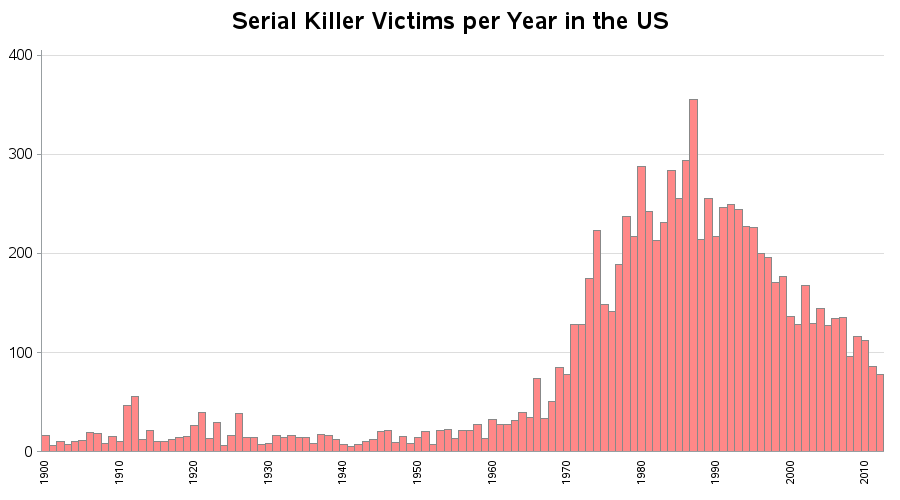“Of 2,604 identified serial killers in the United States during the twentieth century, an astonishing 89.5 percent (2,331) made their appearance between 1950 to 1999, with 88 percent of those appearing in just the three decades from 1970 to 1999—the ‘epidemic’ peak years.” — Peter Vronsky, American Serial Killers: The Deadliest Years, 1950 - 2000.
