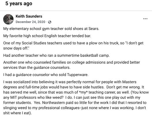 I was socialized into believing it was perfectly normal for people with Masters degrees and full-time jobs would have to have side hustles. Don’t get me wrong. It has served me well, since that was much of *my* teaching career, as well. (You know any MIT professors who like weed? I do. I can just see this one play out with my former students. Yes. Northeastern paid so little for the work I did that I resorted to slinging weed to my professional colleagues—just none where I was working. I don’t shit where I eat).
