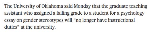 The University of Oklahoma said Monday that the graduate teaching assistant who assigned a failing grade to a student for a psychology essay on gender stereotypes will “no longer have instructional duties” at the university.