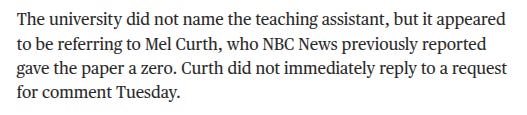 The university did not name the teaching assistant, but it appeared to be referring to Mel Curth, who NBC News previously reported gave the paper a zero. Curth did not immediately reply to a request for comment Tuesday.