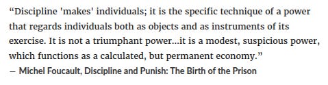 “Discipline ‘makes’ individuals; it is the specific technique of a power that regards individuals both as objects and as instruments of its exercise. It is not a triumphant power…it is a modest, suspicious power which functions as a calculated, but permanent economy.” — Michel Foucault, Discipline and Punish: The Birth of the Prison.